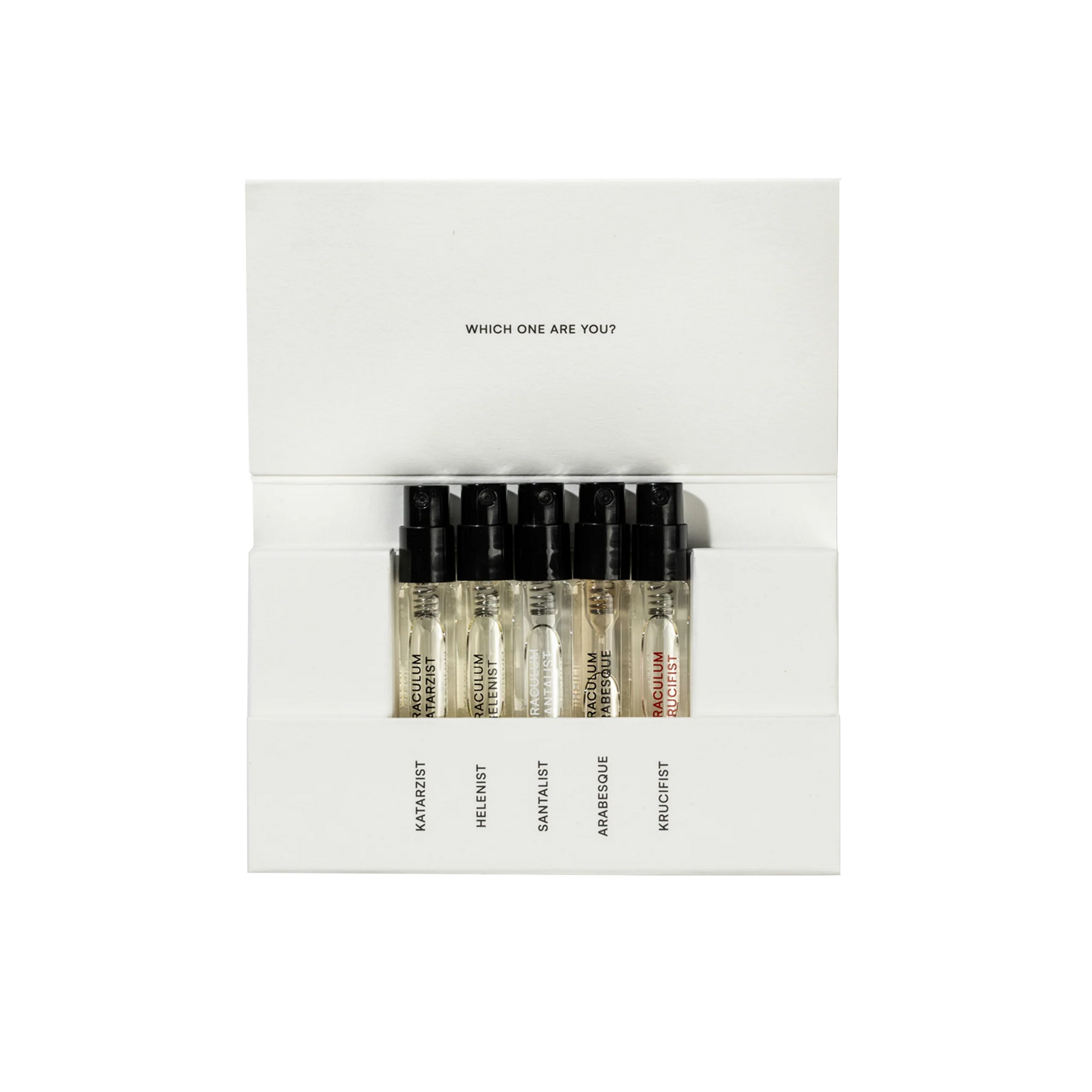 Objevte svět parfémů ORACULUM ukrytý v jedné elegantní krabičce. Sada obsahuje 2ml vzorky pěti vůní – KATARZIST, HELENIST, SANTALIST, ARABESQUE a KRUCIFIST. Každý parfém představuje jedinečný pohled na vnímání prostoru, času a sebe sama.