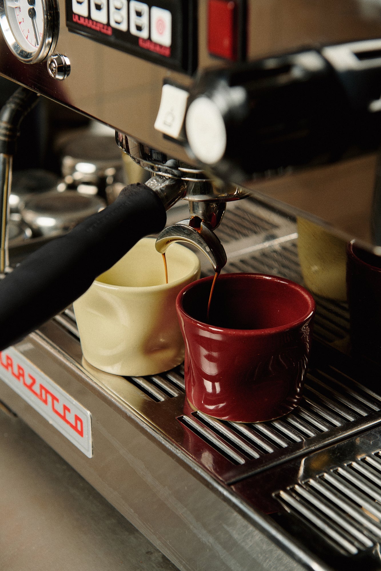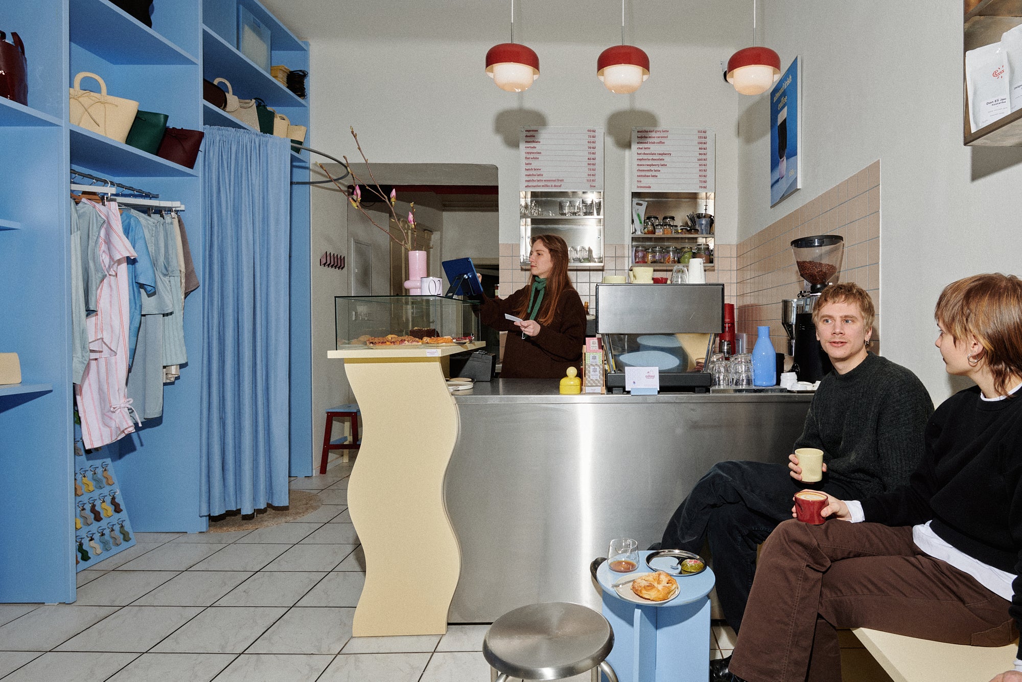 Vysněná představa se stala realitou. Na jedné straně stěna plná produktů z kolekcí kabelek a peněženek a v druhé části espresso bar od manželů Gabriely a Stanislava Hamplových, kteří společně provozují například i kavárnu Čekárnu a Kavárnu Dejvického divadla.