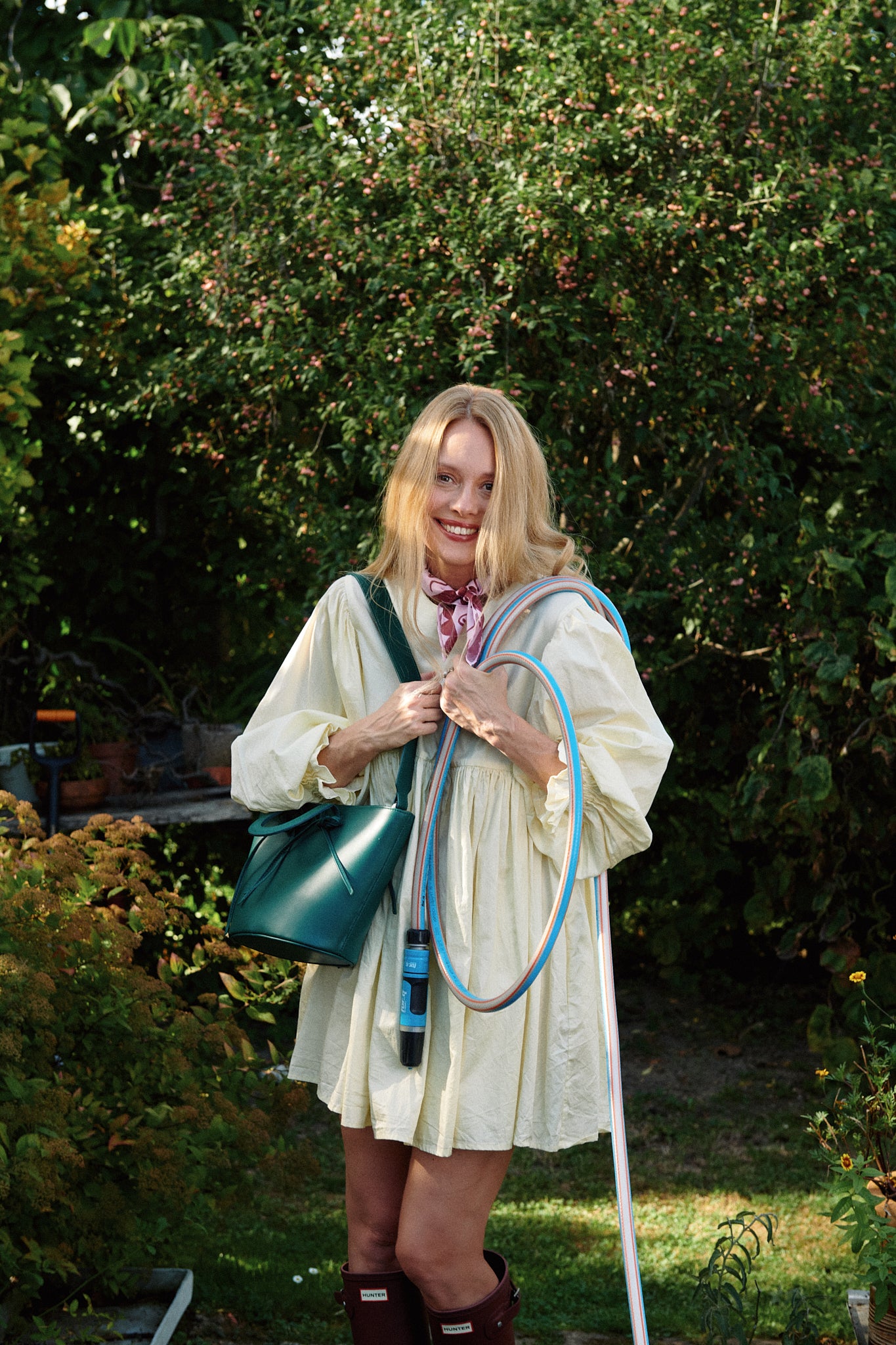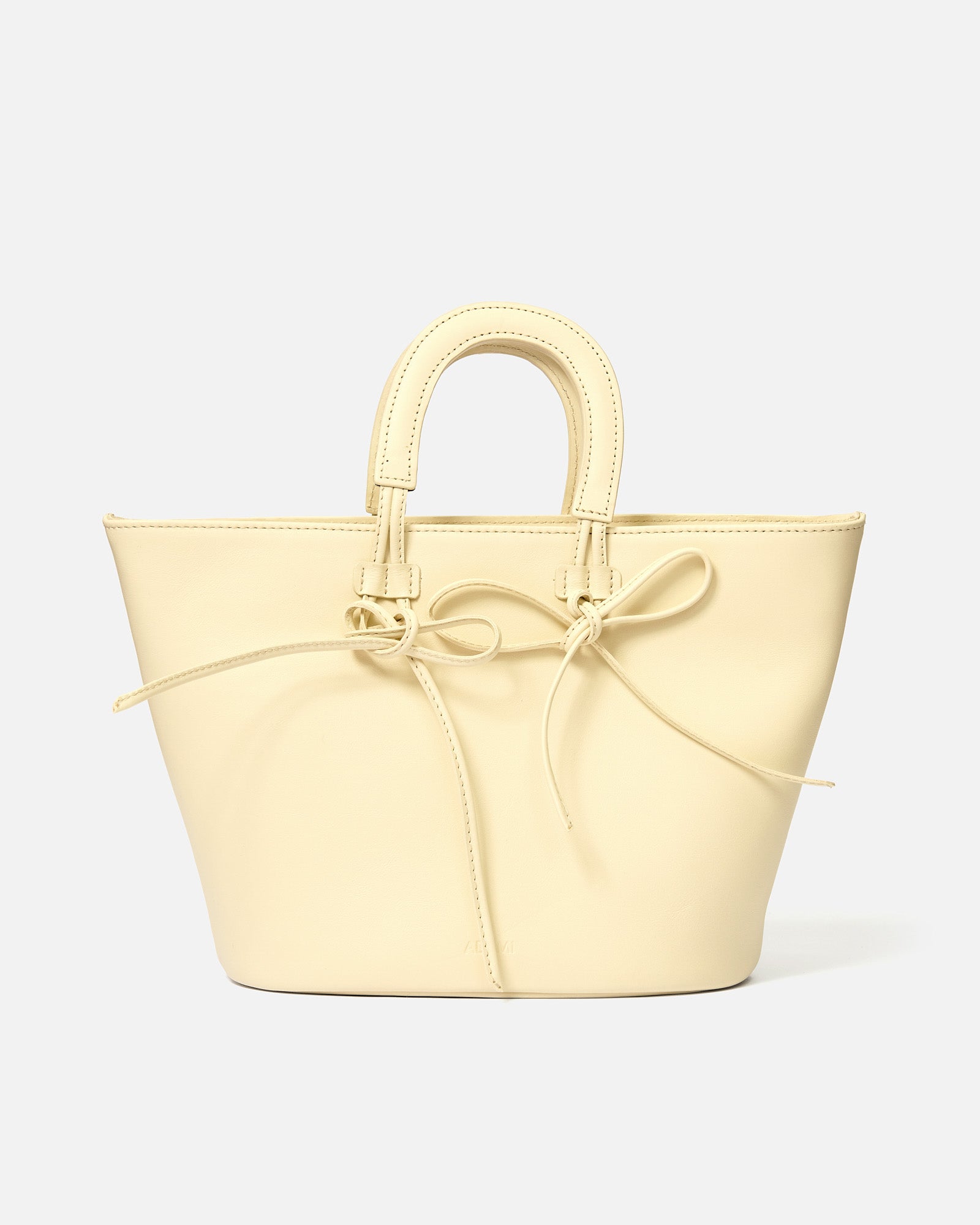 Dno je tvarované do kulata a dutá ucha kabelky jsou provlečena dvěma koženými šňůrami, díky kterým si můžete délku uch jednoduše přizpůsobit – pomocí mašliček. Tento detail je nejen funkční, ale i vizuálně zajímavý a tvoří jeden z charakteristických znaků kabelky.